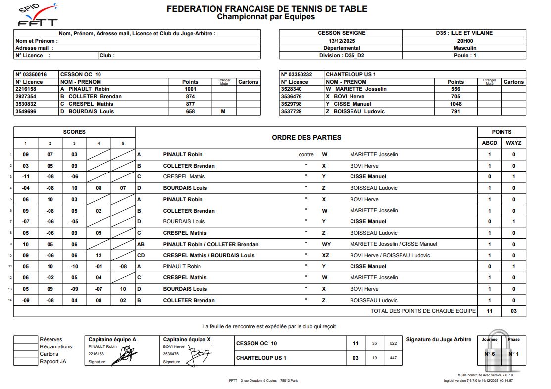 J6 | 13/12 | OC CESSON 10 | 11 - 3 | CHANTELOUP US 1 | |