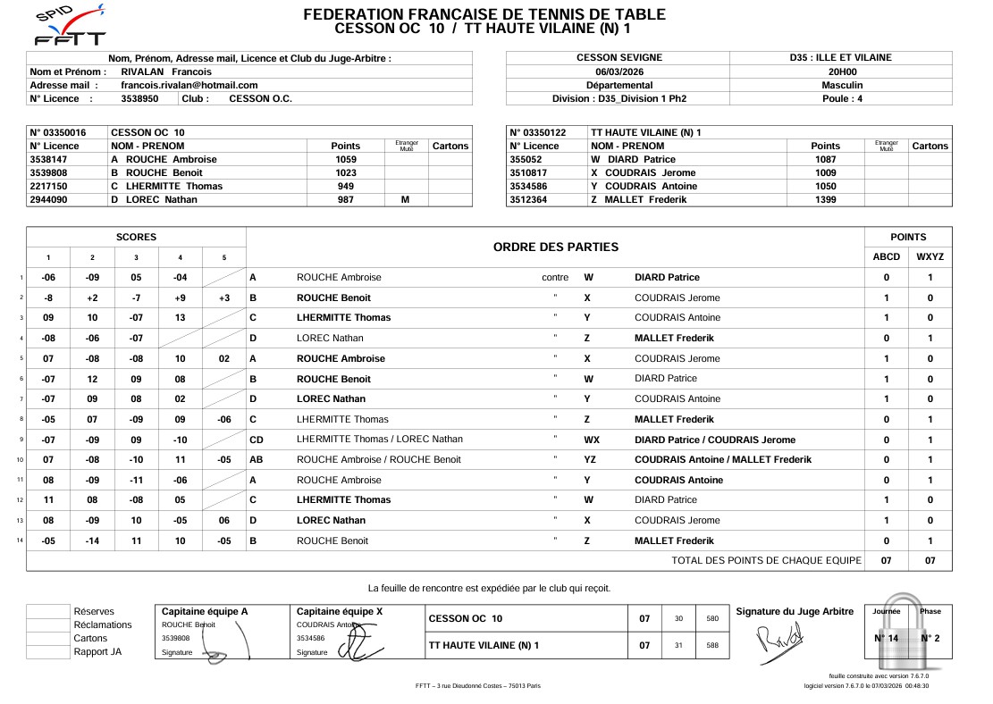 J1 | 20/09 | OC CESSON 10 | 10 - 4 | THORIGNE-FD TT 13 | |