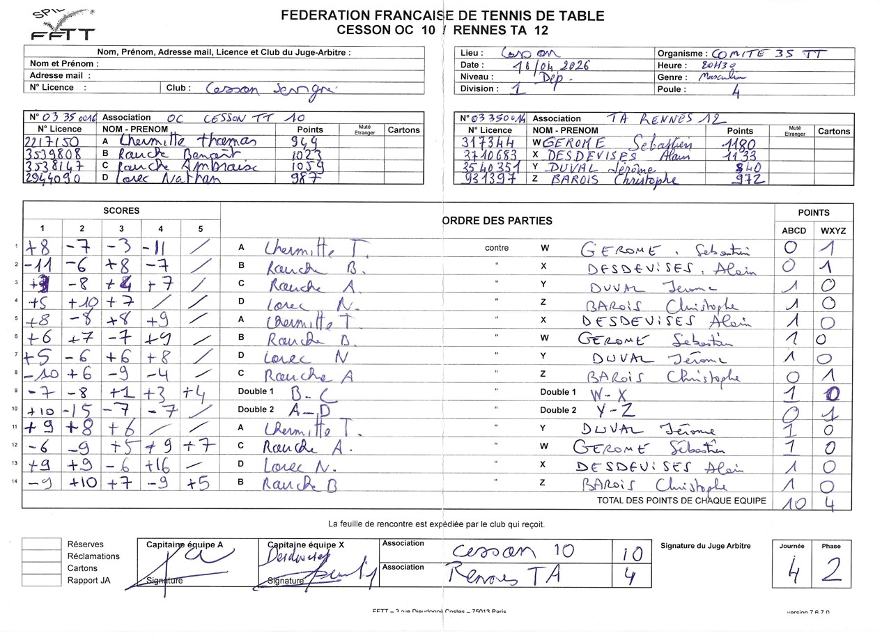 J4 | 10/04 | OC CESSON 10 | 10 - 4 | RENNES TA 12 | |