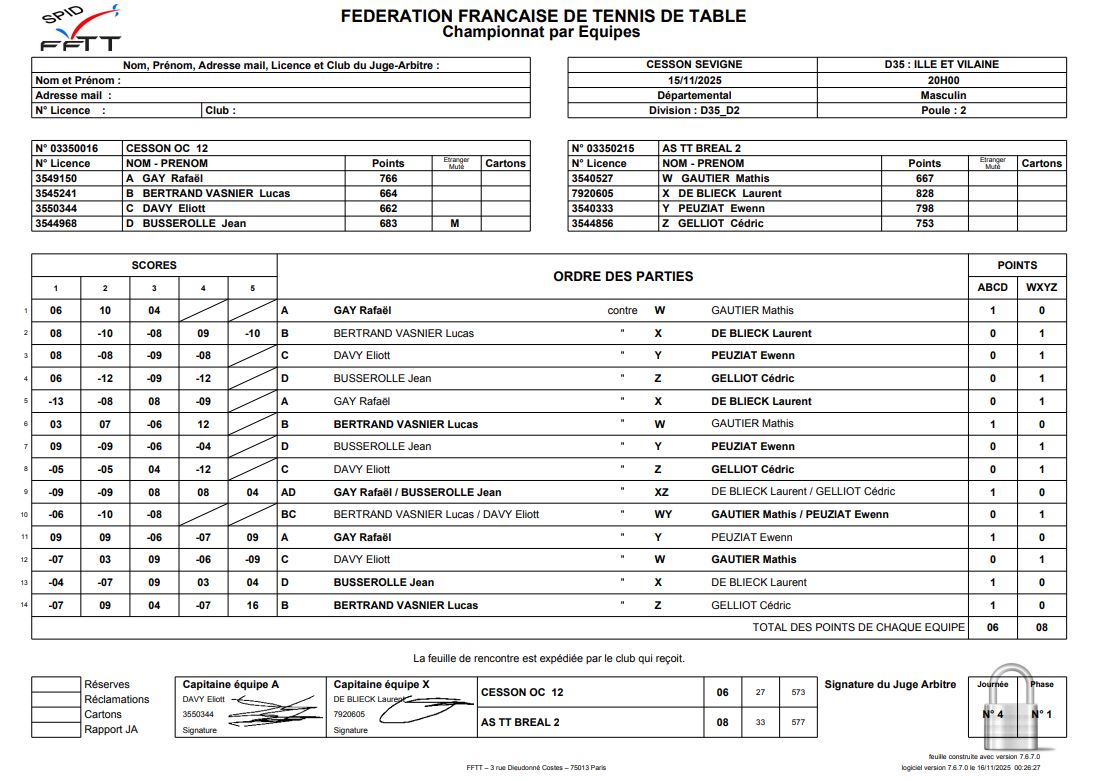 J4 | 15/11 | OC CESSON 12 | 6 - 8 | AS BREAL TT 2 | |