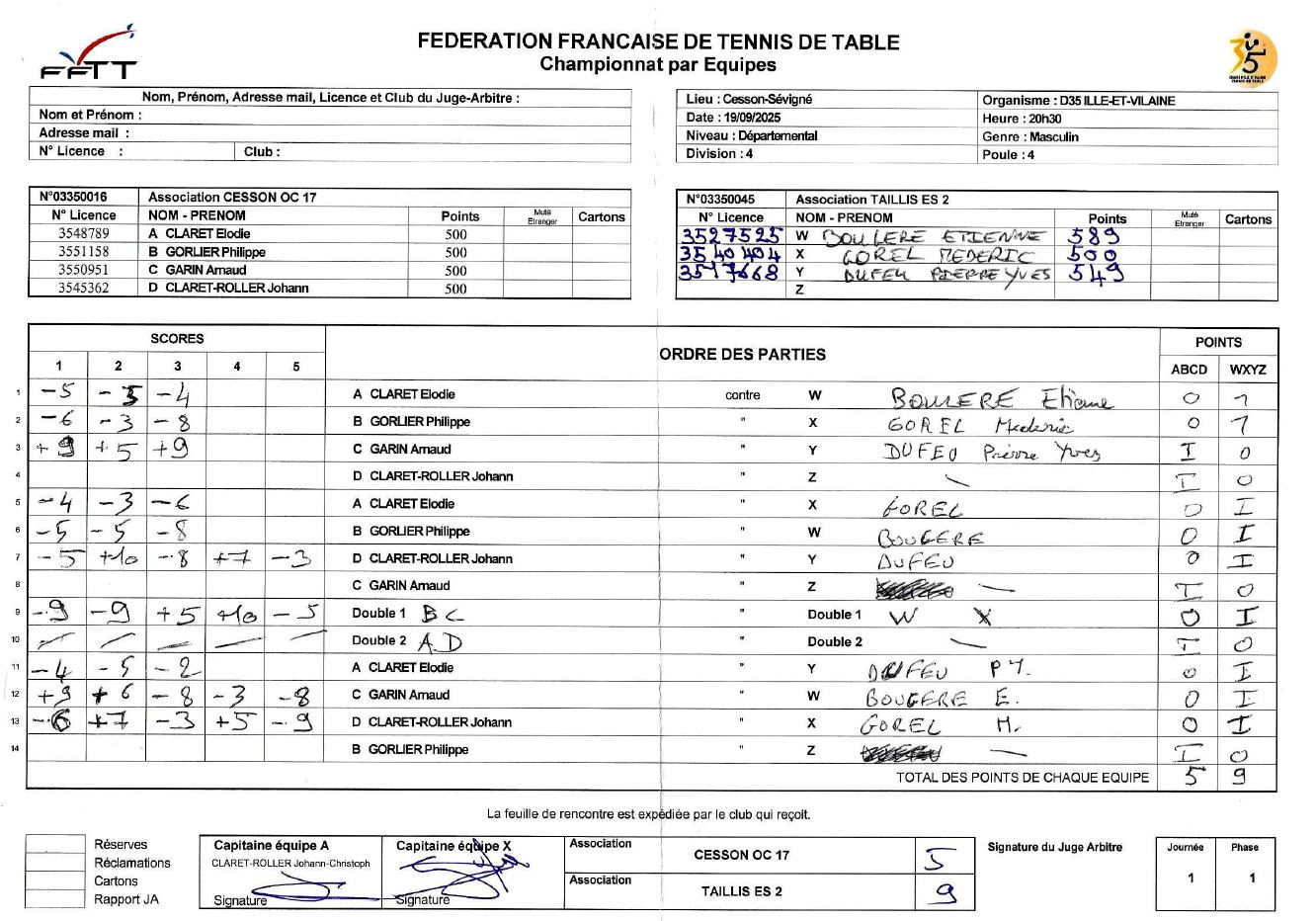 J1 | 19/09 | OC CESSON 17 | 5 - 9 | TAILLIS ES 2 | |