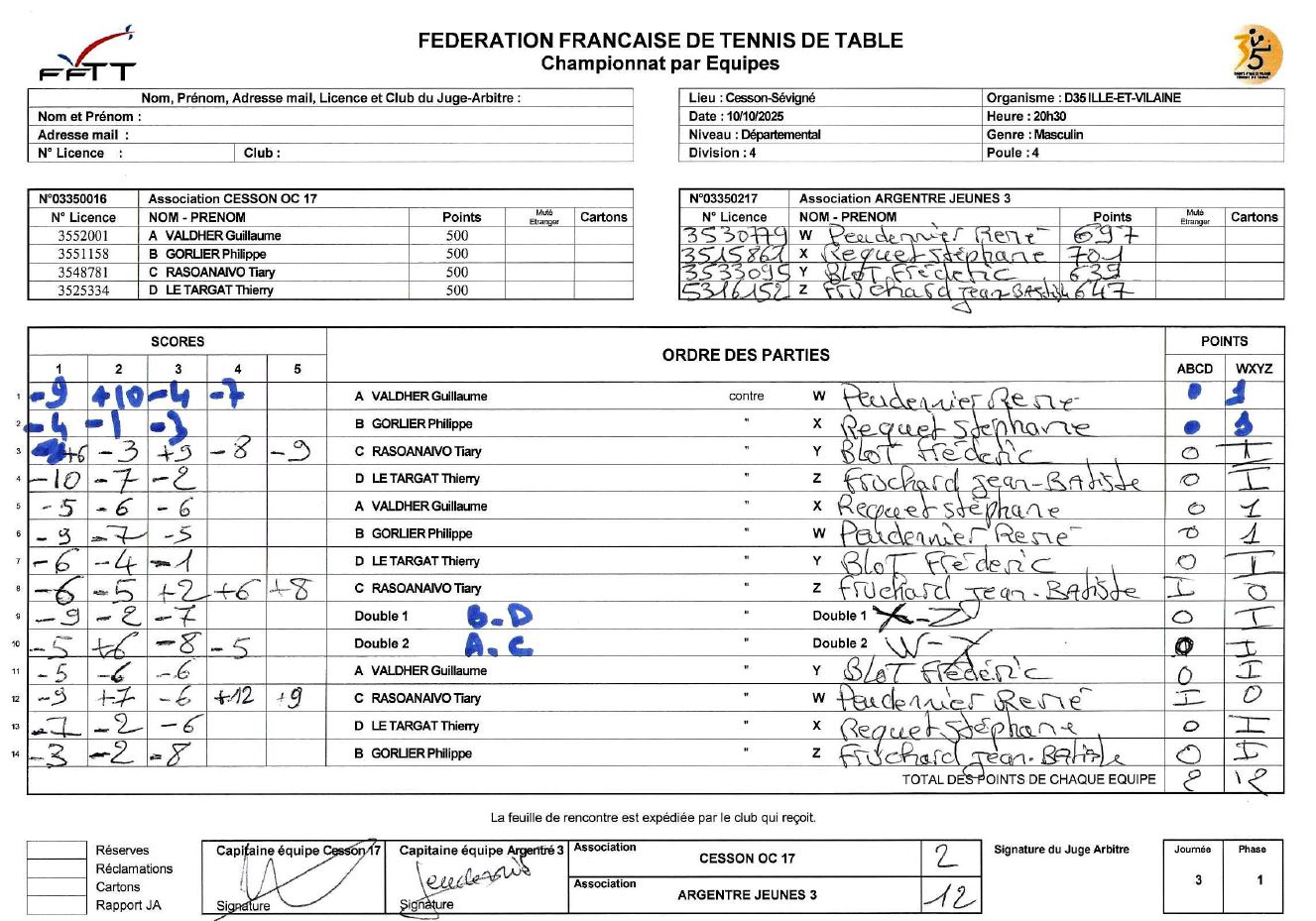 J3 | 10/10 | OC CESSON 17 | 2 - 12 | ARGENTRE JEUNES 3 | |