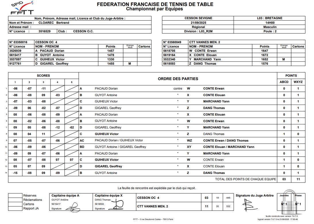 J1 | 21/09 | OC CESSON 4 | 3 - 11 | CTT VANNES MENIMUR 1 | |