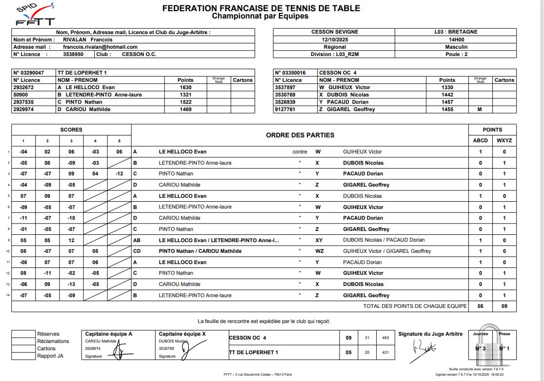 J3 | 12/10 | OC CESSON 4 | 9 - 5 | TT LOPERHET 1 | |