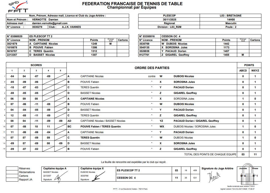 J5 | 30/11 | ES PLESCOP 2 | 3 - 11 | OC CESSON 4 | |