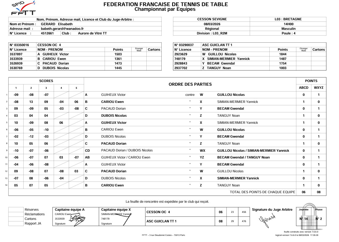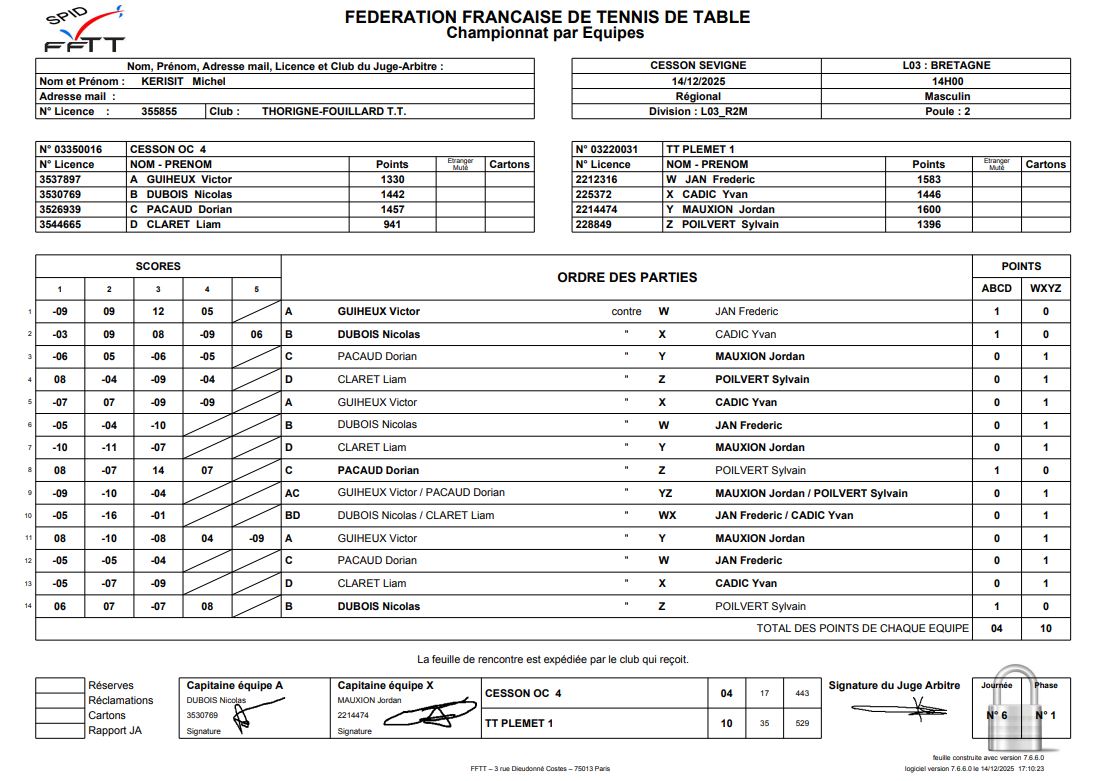 J6 | 14/12 | OC CESSON 4 | 4 - 10 | TT PLEMET 1 | |