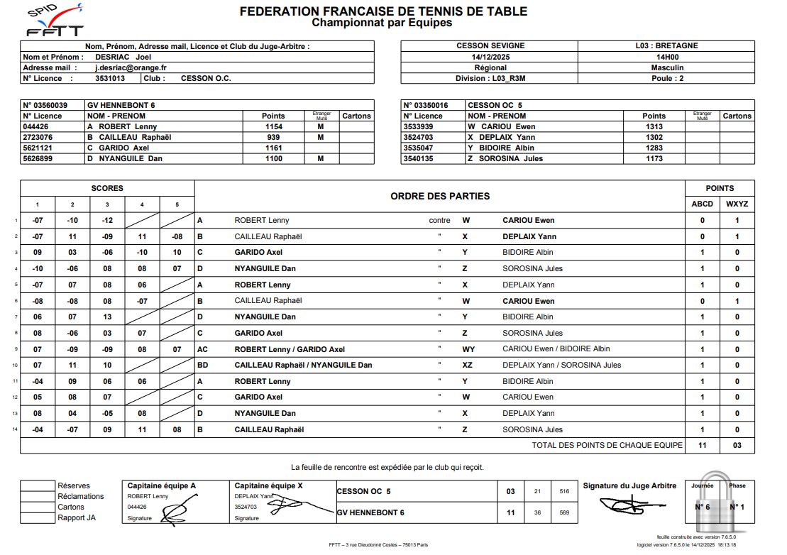 J6 | 14/12 | OC CESSON 5 | 3 - 11 | GV HENNEBONT 6 | |