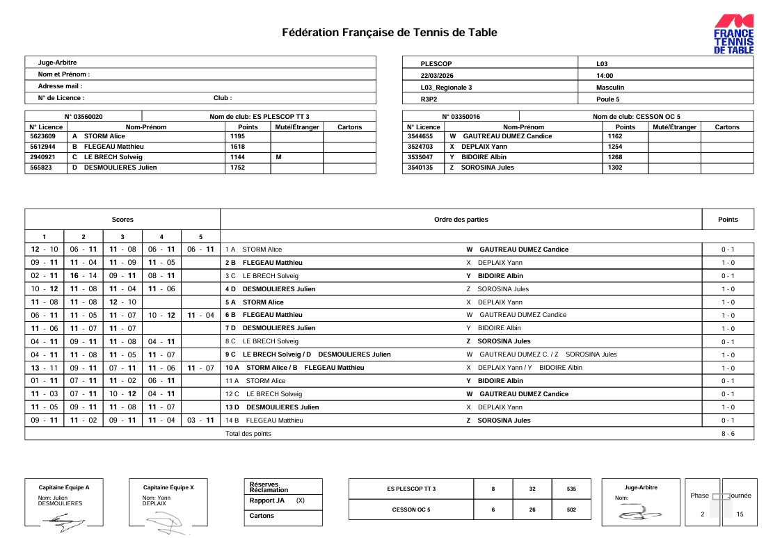 J3 | 22/03 | ES PLESCOP 3 | 8 - 6 | OC CESSON 5 | |
