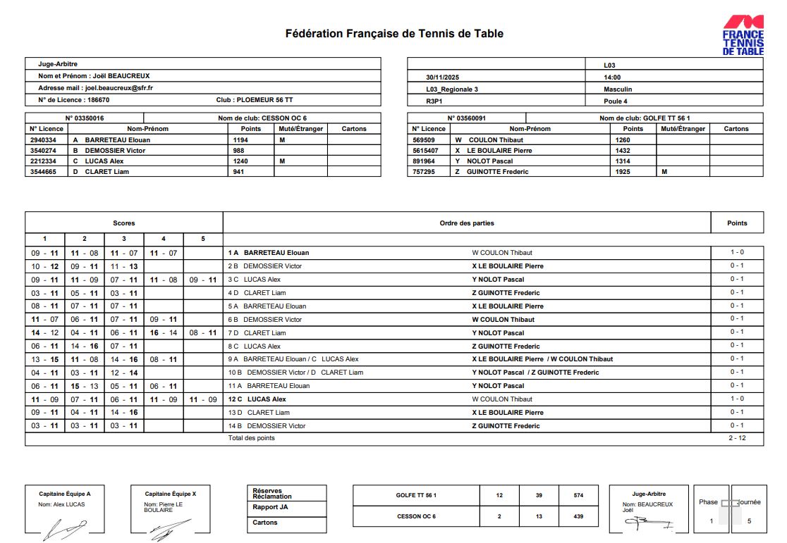 J5 | 30/11 | GOLFE TT 56 1 | 12 - 2 | OC CESSON 6 | |