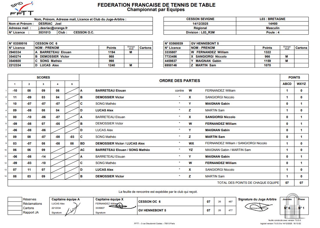 J6 | 14/12 | OC CESSON 6 | 7 - 7 | GV HENNEBONT 5 | |