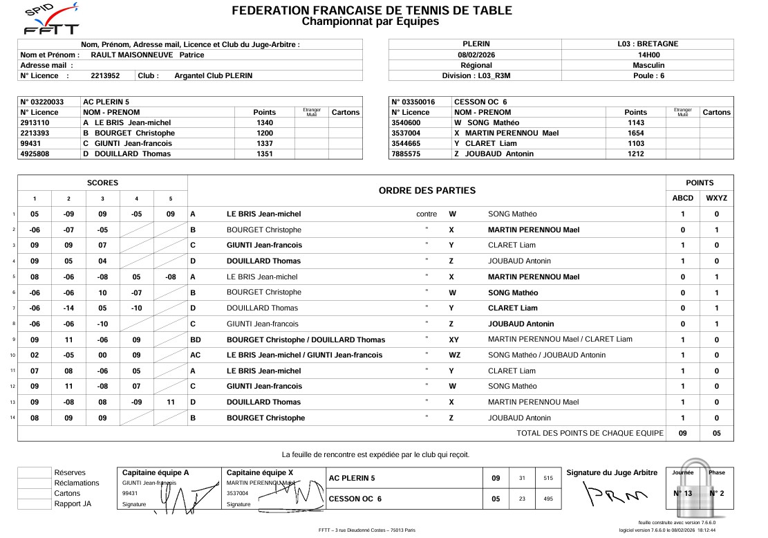 J1 | 08/02 | AC PLERIN 5 | 9 - 5 | OC CESSON 6 | |