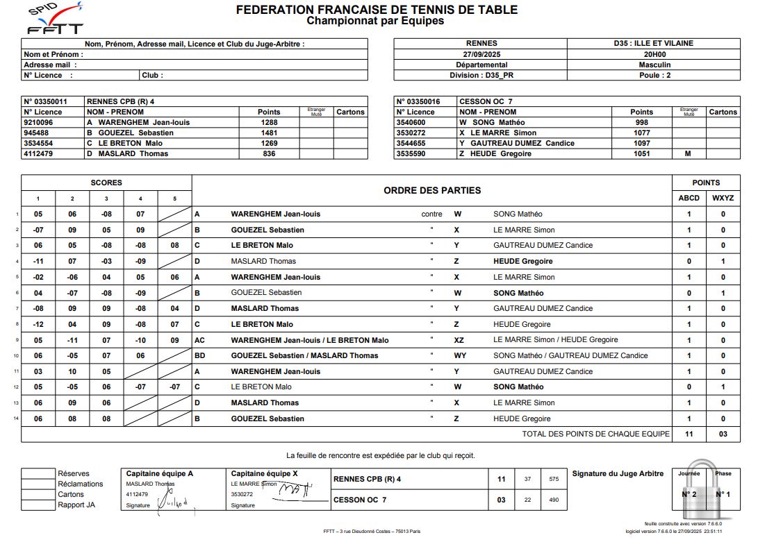J2 | 27/09 | RENNES CPB 4 | 11 - 3 | OC CESSON 7 | |