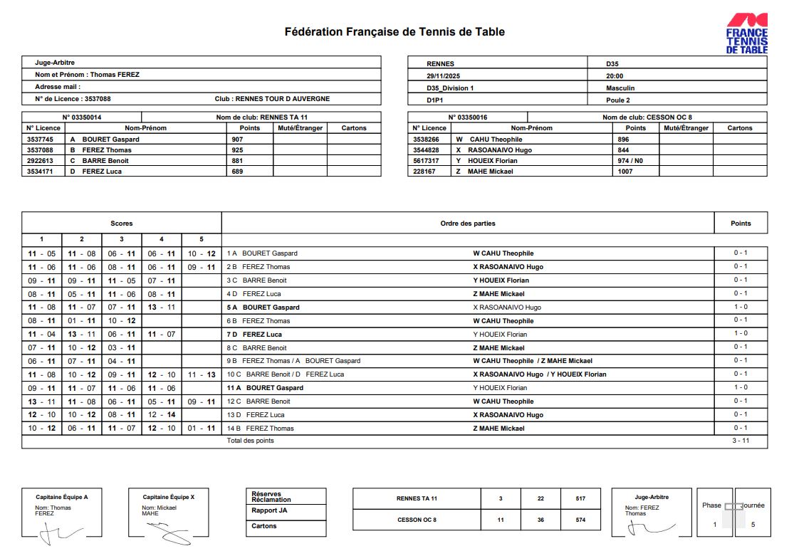 J4 | 15/11 | OC CESSON 8 | 8 - 6 | TT REDON 1 | |