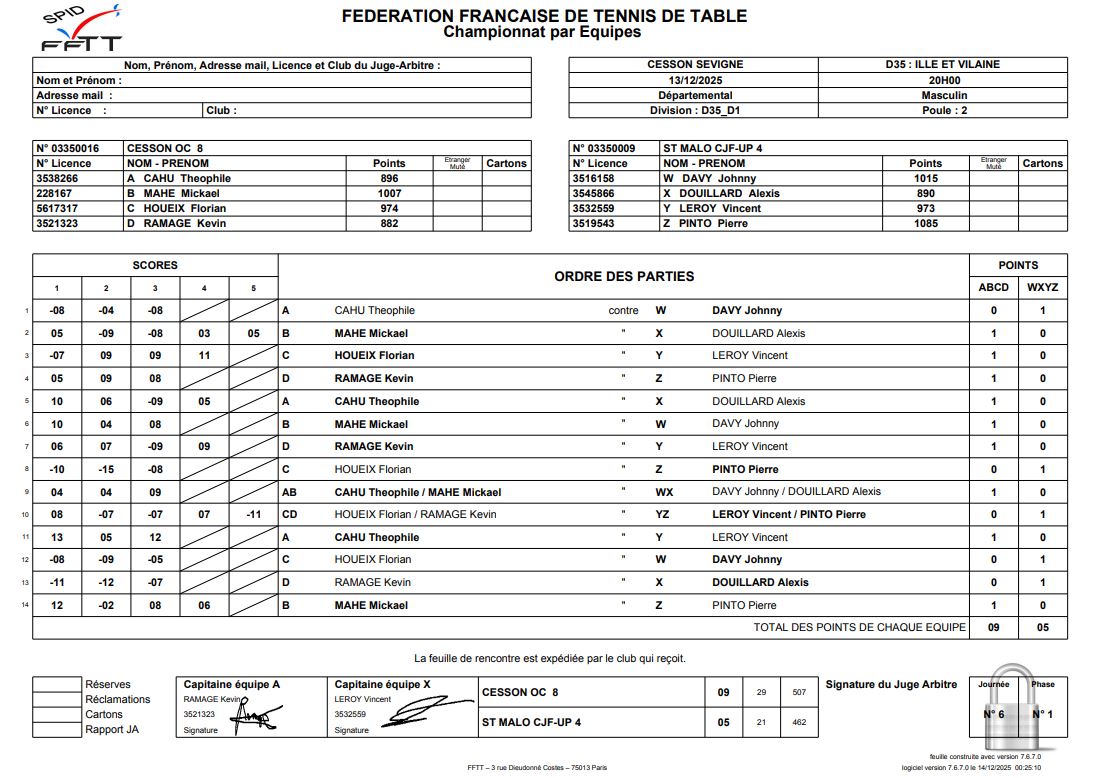 J6 | 13/12 | OC CESSON 8 | 9 - 5 | ST MALO CJF/UP 4 | |