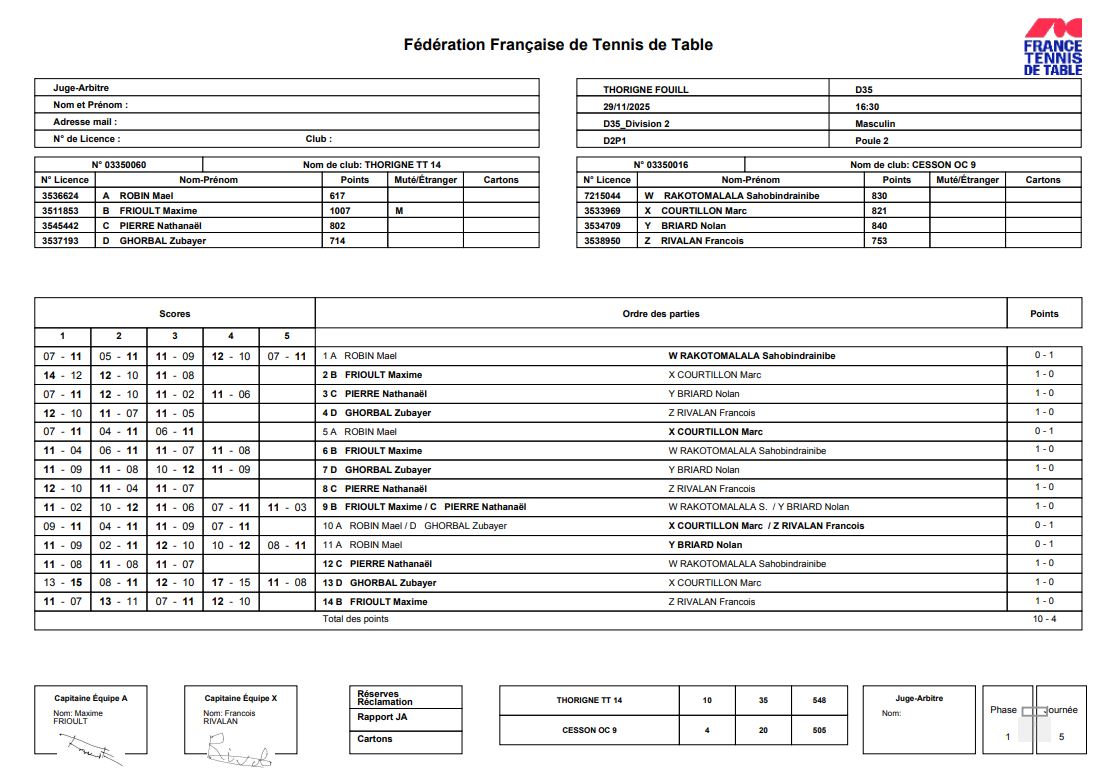 J5 | 29/11 | THORIGNE-FD TT 14 | 10 - 4 | OC CESSON 9 | |
