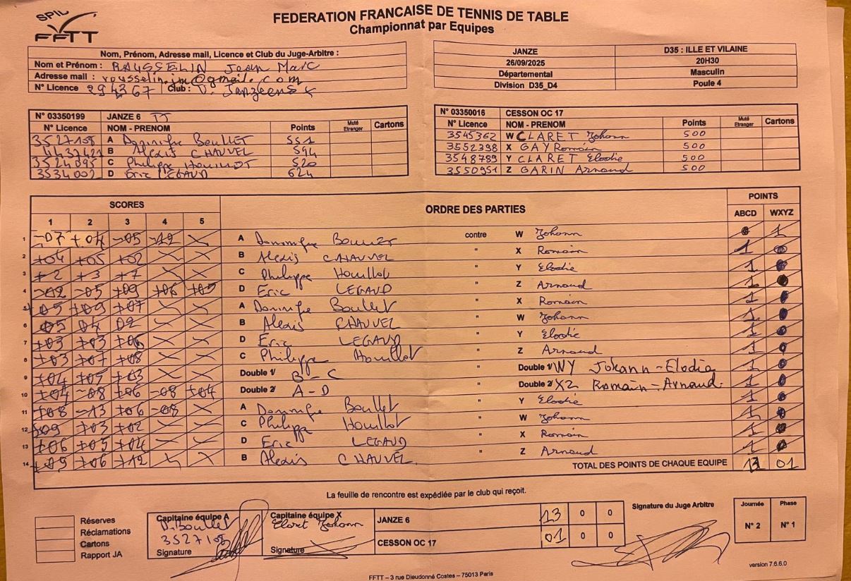 J2 | 26/09 | JANZE VOLONTAIRES 6 | 13 - 1 | OC CESSON 17 | |