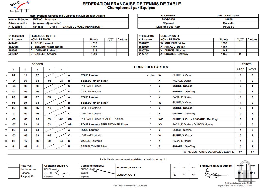 J3 | 12/10 | OC CESSON 4 | 9 - 5 | TT LOPERHET 1 | |