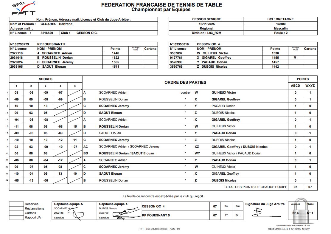 J4 | 16/11 | OC CESSON 4 | 7 - 7 | RP FOUESNANT 5 | |