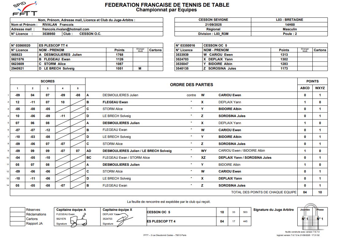 J1 | 21/09 | OC CESSON 5 | 10 - 4 | ES PLESCOP 4 | |