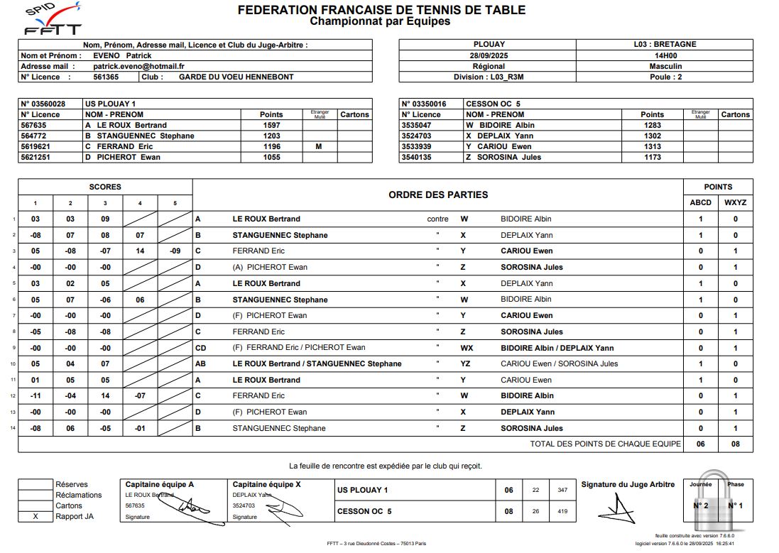 J2 | 28/09 | US PLOUAY 1 | 6 - 8 | OC CESSON 5 | |
