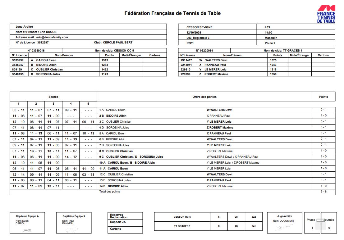 J3 | 12/10 | OC CESSON 5 | 6 - 8 | TT GRACES 1 | |