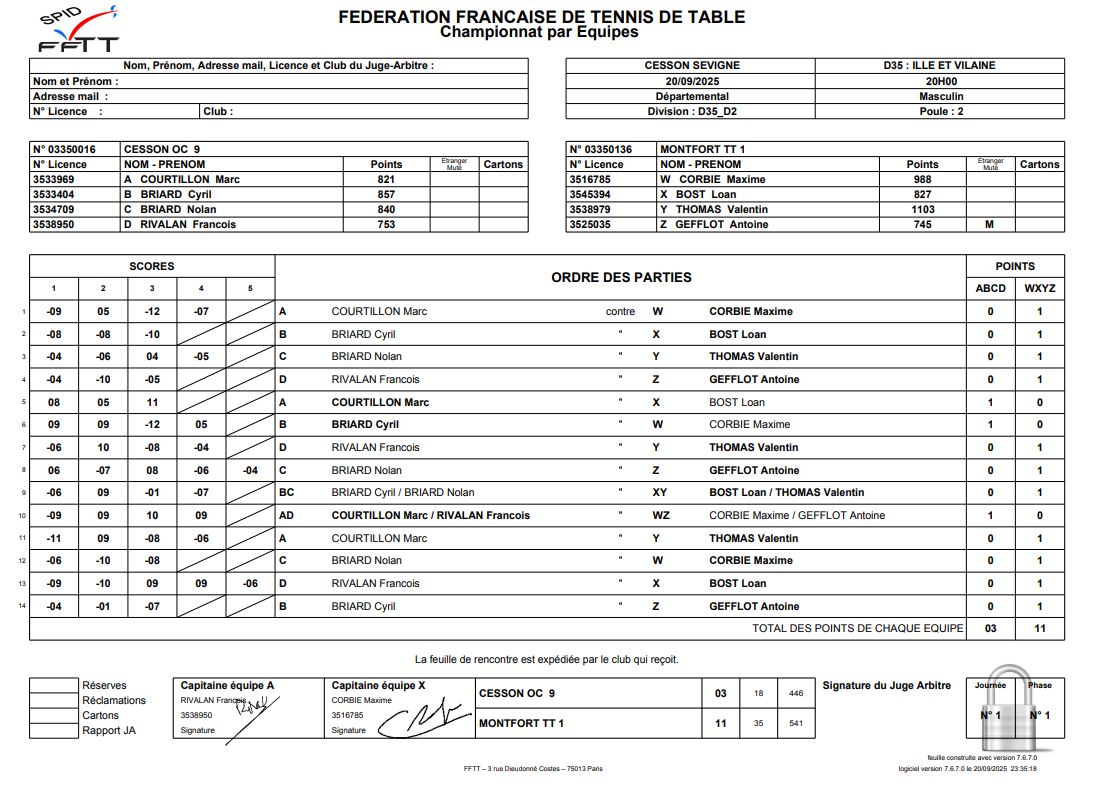 J1 | 20/09 | OC CESSON 9 | 3 - 11 | MONTFORT TT 1 | |