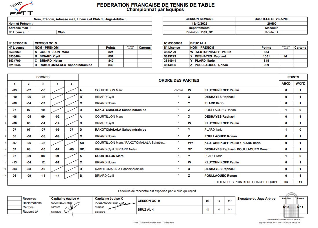 J6 | 13/12 | OC CESSON 9 | 3 - 11 | BRUZ AL 4 | |